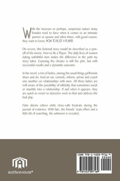 With the insecure or perhaps, suspicious nature many females tend to have when it comes to an intimate partner or spouse and often times, with good reason, they want to know, How to Bust a Player. On screen, this fictional story would be described as a spin-off of the movie, How to Be a Player. The daily lives of women dating unfaithful men makes the difference in the path my story takes. Exposing the cheater is still the plot, but with successful results and a dynamite outcome. In the novel, a trio of ladies, among the usual things girlfriends share and do, lend an ear, console, inform, advise and coach one another on relationships with men. All three ladies are well aware of the possibility of infidelity that sometimes sneak or stumble into a relationship. If and when it appears, they are quick to resort to detective work to find and address the foul play. False alarms relieve while close-calls frustrate during the pursuit of evidence. With fate, the friends' team effort and a little bit of searching, the unknown is revealed.