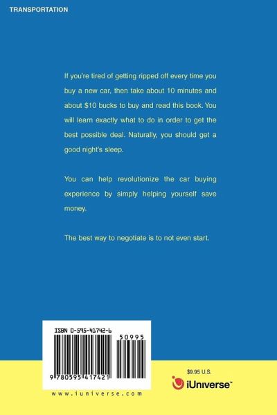 If you're tired of getting ripped off every time you buy a new car, then take about 10 minutes and about $10 bucks to buy and read this book. You will learn exactly what to do in order to get the best possible deal. Naturally, you should get a good night's sleep. You can help revolutionize the car buying experience by simply helping yourself save money. The best way to negotiate is to not even start.