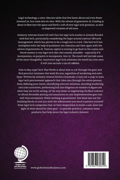 Legal technology, a once-obscure niche that few knew about and even fewer invested in, has come into its own. With the advent of generative AI, funding is about to flow into the space and birth a raft of new legal tech products, as well as improved versions of old ones. If all of this sounds good for buyers, it is – in the long run. In the short run, however, we are likely looking at a “perfect storm” akin to the runup to the dotcom crash of 2000, when the market correctly surmised there were billions to be made on the internet, but utterly failed to discern how those billions would be made. Industry veterans know full well that the legal tech market is already flooded with bad tech, particularly considering all the hype around contract lifecycle management, which has proven to be a much tougher nut to crack than anyone imagined. This bad tech has multiplied with the help of pandemic-era stimulus and then again with the advent of generative AI. Now, with the Fed poised to lower interest rates yet again, venture capital is rearing to go back to the casino and throw money at any legal tech idea that sounds plausible – especially if it incorporates, or purports to incorporate, Gen AI. The result will include some of the most thoughtful, innovative legal tech solutions the world has ever seen. It will also include a ton of rubbish. How to Buy Legal Technology That Works is about how to cut through the grist and find practical solutions that work for you, regardless of marketing and sales hype. Written by Nathan Cemenska, an industry veteran who has represented both buyers of legal tech and a very prominent seller, it lays out a soup-to-nuts legal tech procurement approach that takes you through the entire process, from defining your needs, identifying relevant solutions, decoding marketing and sales narratives, performing full due diligence on vendors to figure out what they are really selling, all the way down to negotiating the final contract to obtain favorable pricing and assurances in case implementation goes less well than envisioned. While nothing is guaranteed, this book will lay out the building blocks to arm you with all the information you need to protect yourself from legal tech companies that, in their desperation to make a sale, have lost sight of what should be their goal – to provide practical, common-sense products that help move the legal industry forward.