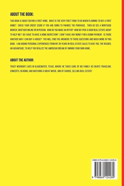 This book is about buying a first home. What is the very first thing to do when planning to buy a first home? Check your credit score if you are going to finance the purchase. Then go see a mortgage broker, whether online or in person. How do you make an offer? How do I pick a good real estate agent to help me? Do I have to have a home inspection? I don't have any money for a down payment. Is there another way I can buy a house? You will find the answers to those questions and much more in this book. I am adding personal experiences from my 28 years in real estate sales to give you, the reader, an advantage, to help you realize The American Dream of owning your own home..