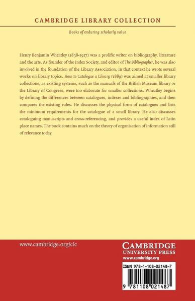 Henry Benjamin Wheatley (1838-1917) was a prolific writer on bibliography, literature and the arts. As founder of the Index Society, and editor of The Bibliographer, he was also involved in the foundation of the Library Association. In that context he wrote several works on library topics. How to Catalogue a Library (1889) was aimed at smaller library collections, as existing systems, such as the manuals of the British Museum library or the Library of Congress, were too elaborate for smaller collections. Wheatley begins by defining the differences between catalogues, indexes and bibliographies, and then compares the existing rules. He discusses the physical form of catalogues and lists the minimum requirements for the catalogue of a small library. He also discusses cataloguing manuscripts and cross-referencing, and provides a useful index of Latin place names. The book contains much on the theory of organisation of information still of relevance today.