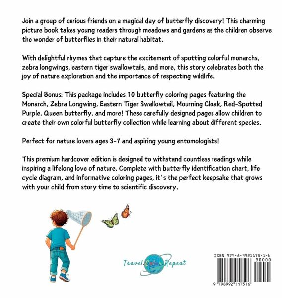 How to Catch a Butterfly This delightful picture book follows a group of children on their quest to discover the colorful world of butterflies. Through lyrical rhyming text, young readers learn the gentle art of butterfly observation as they explore meadows and gardens alongside the book's enthusiastic protagonists. This beautifully illustrated hardcover introduces children to popular butterfly species, including the Monarch, Zebra Longwing, Eastern Tiger Swallowtail, Mourning Cloak, and others. Each spread highlights distinctive characteristics of different butterflies while weaving an engaging narrative that captures the excitement of nature exploration. Beyond butterfly identification, the story delivers a subtle conservation message about respecting wildlife and appreciating creatures in their natural habitat. The narrative builds toward a thoughtful conclusion where the children choose to let the butterflies fly free, teaching young readers that some treasures are best enjoyed in the moment rather than possessed. The book concludes with 10 detailed butterfly coloring pages, extending the educational experience beyond the story and allowing children to create their own colorful butterfly collection. This premium hardcover edition is designed to withstand countless readings while inspiring a lifelong love of nature. Complete with butterfly identification chart, life cycle diagram, and informative coloring pages, it's the perfect keepsake that grows with your child from story time to scientific discovery. Combines entertainment with science education about butterfly species Rhyming text perfect for read-aloud sessions Teaches respect for nature and wildlife Bonus educational coloring pages extend the learning experience Durable hardcover format ideal for library collections Appeals to parents, educators, and gift-givers seeking quality children's literature