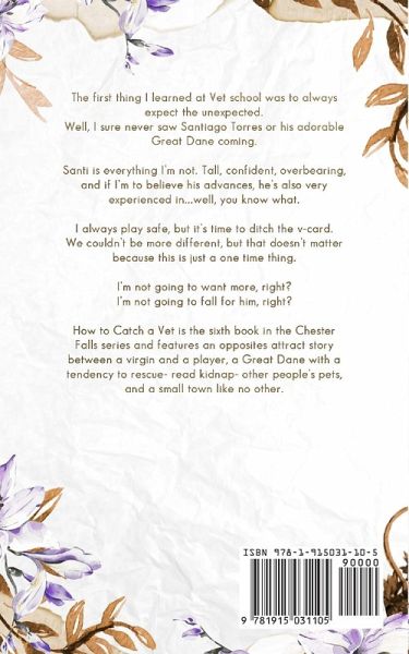 The first thing I learned at Vet school was to always expect the unexpected. Well, I sure never saw Santiago Torres or his adorable Great Dane coming. Santi is everything I'm not. Tall, confident, overbearing, and if I'm to believe his advances, he's also very experienced in...well, you know what. I always play safe, but it's time to ditch the v-card. We couldn't be more different, but that doesn't matter because this is just a one time thing. I'm not going to want more, right? I'm not going to fall for him, right? How to Catch a Vet is the sixth book in the Chester Falls series and features an opposites attract story between a virgin and a player, a Great Dane with a tendency to rescue- read kidnap- other people's pets, and a small town like no other.