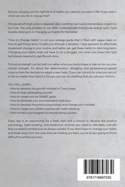 Are you carrying out the right kind of habits you need to succeed in life? If you aren't, what can you do to change that? The power of small actions repeated daily overtime can have a tremendous impact on our lives. The only problem is, we often underestimate that power and as such, have trouble sticking to or changing our habits for the better. "How to Change Habits" is not your average guide that is filled with vague steps on how to get things done. It walks you through a detailed, 7 step approach to effectively implement change in your routine and better yet, get these habits to stick long-term. Changing your habits does not have to be a struggle, not when you know the right techniques required to get the job done. If physical strength can be built no matter what your body shape or size, so too can your mental strength. It's about the determination, discipline, and perseverance aspect more so than the decision to adopt a new habit. If you can commit to what you set out to do no matter how hard it is for you, you can do anything that you set your mind to. YOU WILL LEARN: ¿ How to develop the growth mindset in 7 easy steps. ¿ How to stop sabotaging yourself. ¿ How to create and set SMART goals. ¿ How to eliminate your procrastination addiction. ¿ How to develop the positive psychology and change your mindset. ¿ How to create your perfect routine with habit-stacking. ¿ How to track your progress to ensure lasting success. Every day is an opportunity for a fresh start and a chance to develop the positive psychology, habit-building, and productive routines you need to ultimately cultivate that successful mindset you've always wanted. If you don't learn to change your habits and break away from the ones that are holding you back, you're always going to find it difficult to achieve success!