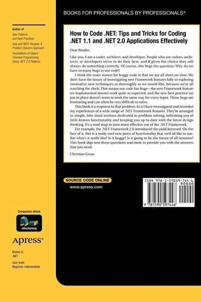 How to Code .NET: Tips and Tricks for Coding .NET 1.1 and .NET 2.0 Applications Effectively provides solutions to certain problems. That is, specific problems. This book provides detailed, authoritative explanations of good .NET coding techniques. It's based on award-winning material that author Christian Gross has previously presented at conferences throughout the U.S. and Europe. What's more, the author is at the forefront of the .NET technology wave and an acknowledged expert on the subject of .NET coding style and techniques.