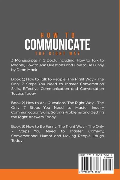 3 Manuscripts in 1 Book, Including: How to Talk to People, How to Ask Questions and How to Be Funny! Book 1) How to Talk to People: The Right Way - The Only 7 Steps You Need to Master Conversation Skills, Effective Communication and Conversation Tactics Today Here's What You'll Learn:How to prepare and have the right mindset to have a conversation with the desired person How to learn to listen to the other person How to ask the right questions, when to ask them, and how to design them to achieve what you want How to talk about yourself and share your personality with the person you're talking to in the best way possible How to master body language Book 2) How to Ask Questions: The Right Way - The Only 7 Steps You Need to Master Inquiry Communication Skills, Solving Problems and Getting the Right Answers Today Here's What You'll Learn:How to plan out your conversation in advance and prepare for it How to logically formulate your questions so that they make sense and are relevant with the flow of the conversation How to understand the emotions that your questions might evoke in the person you're talking to Book 3) How to Be Funny: The Right Way - The Only 7 Steps You Need to Master Comedy, Conversational Humor and Making People Laugh Today Here's What You'll Learn:Some information about why humor is important in general, as well as when it's appropriate to use it The importance of taking risks in order to learn what type of humor fits different people and situations How to study, learn and practice being funny You have made an excellent decision by choosing to learn more about how to communicate. So, don't delay it any longer. Order "How to Communicate" Now!