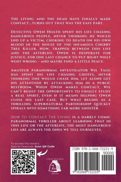 The living and the dead have finally made contact. Turns out that was the easy part. Detective Owen Hoath spent his life chasing dangerous people, never thinking he would end up a victim, choking to death on his own blood in the house of the infamous Cherry Tree Killer. Now, trapped between this life and the afterlife, Owen is desperate for justice, for one last chance to put right what went wrong - and maybe find a little peace. Amateur paranormal investigator Wil Tagg has spent his life chasing ghosts, never thinking one would chase him, let alone get his attention by attacking him in a public restroom. When Owen makes contact, Wil can't resist the opportunity to finally study a real spirit, even if it means helping Owen close his last case. But what begins as a thrilling supernatural partnership quickly spirals into something far more sinister. As Wil is pulled deeper into the mystery of Owen's death, he discovers that the living aren't always who they appear to be - and the dead can't be trusted either. With a killer on the loose and Owen's restless spirit growing more desperate by the day, Wil has to decide who to trust before he becomes the next victim. How To Contact The Living is a darkly comic paranormal thriller about learning that in this life or the afterlife, the most dangerous lies are always the ones we tell ourselves.