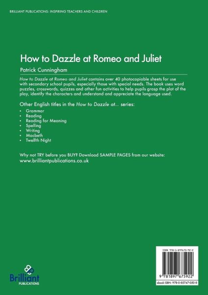 How to Dazzle at Romeo and Juliet contains over 40 photocopiable sheets for use with secondary school pupils, especially those with special needs. The book uses word puzzles, crosswords, quizzes and other fun activities to help pupils grasp the plot of the play, identify the characters and understand and appreciate the language used.