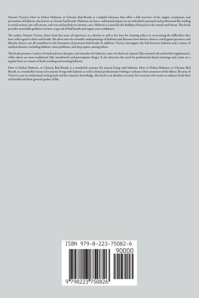 Ninette Victory's How to Defeat Halitosis, or Chronic Bad Breath, is a helpful reference that offers a full overview of the origins, treatments, and prevention of halitosis, also known as chronic bad breath. Halitosis can have a substantial impact on an individual's personal and professional life, leading to social anxiety, low self-esteem, and even melancholy in extreme cases. Halitosis is caused by the buildup of bacteria in the mouth and throat. This book provides actionable guidance on how to get rid of bad breath and regain your confidence. The author, Ninette Victory, draws from her years of experience as a dentist as well as her love for assisting others in overcoming the difficulties they have with regard to their oral health. She dives into the scientific underpinnings of halitosis and discusses how dietary choices, oral hygiene practices, and lifestyle choices can all contribute to the formation of persistent bad breath. In addition, Victory investigates the link between halitosis and a variety of medical diseases, including diabetes, sinus problems, and sleep apnea, among others. This book presents a variety of tried-and-true therapies and remedies for halitosis, some of which are natural (like essential oils and herbal supplements), while others are more traditional (like mouthwash and prescription drugs). It also discusses the need for professional dental cleanings and exams on a regular basis as a means of both avoiding and treating halitosis. How to Defeat Halitosis, or Chronic Bad Breath, is a wonderful resource for anyone living with halitosis. How to Defeat Halitosis, or Chronic Bad Breath, is a wonderful resource for anyone living with halitosis as well as dental professionals wishing to enhance their awareness of the illness. Because of Victory's easy-to-understand writing style and her extensive knowledge, this book is an absolute necessity for everyone who wants to enhance both their oral health and their general quality of life.
