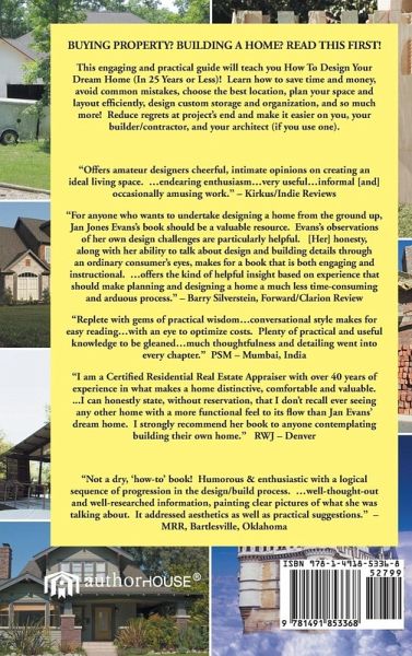 BUYING PROPERTY? BUILDING A HOME? READ THIS FIRST! This engaging and practical guide will teach you How To Design Your Dream Home (In 25 Years or Less)! Learn how to save time and money, avoid common mistakes, choose the best location, plan your space and layout efficiently, design custom storage and organization, and so much more! Reduce regrets at project's end and make it easier on you, your builder/contractor, and your architect (if you use one). "Offers amateur designers cheerful, intimate opinions on creating an ideal living space. ...endearing enthusiasm...very useful...informal [and] occasionally amusing work." - Kirkus/Indie Reviews "For anyone who wants to undertake designing a home from the ground up, Jan Jones Evans's book should be a valuable resource. Evans's observations of her own design challenges are particularly helpful. [Her] honesty, along with her ability to talk about design and building details through an ordinary consumer's eyes, makes for a book that is both engaging and instructional. ...offers the kind of helpful insight based on experience that should make planning and designing a home a much less time-consuming and arduous process." - Barry Silverstein, Forward/Clarion Review "Replete with gems of practical wisdom...conversational style makes for easy reading...with an eye to optimize costs. Plenty of practical and useful knowledge to be gleaned...much thoughtfulness and detailing went into every chapter." PSM - Mumbai, India "I am a Certified Residential Real Estate Appraiser with over 40 years of experience in what makes a home distinctive, comfortable and valuable. ...I can honestly state, without reservation, that I don't recall ever seeing any other home with a more functional feel to its flow than Jan Evans' dream home. I strongly recommend her book to anyone contemplating building their own home." RWJ - Denver "Not a dry, 'how-to' book! Humorous & enthusiastic with a logical sequence of progression in the design/build process. ...well-thought-out and well-researched information, painting clear pictures of what she was talking about. It addressed aesthetics as well as practical suggestions." - MRR, Bartlesville, Oklahoma