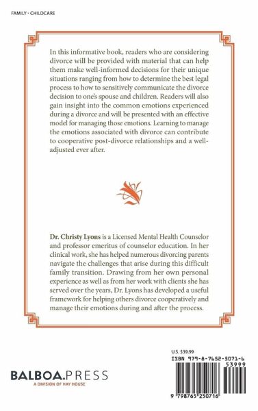 In this informative book, readers who are considering divorce will be provided with material that can help them make well-informed decisions for their unique situations ranging from how to determine the best legal process to how to sensitively communicate the divorce decision to one's spouse and children. Readers will also gain insight into the common emotions experienced during a divorce and will be presented with an effective model for managing those emotions. Learning to manage the emotions associated with divorce can contribute to cooperative post-divorce relationships and a well-adjusted ever after.