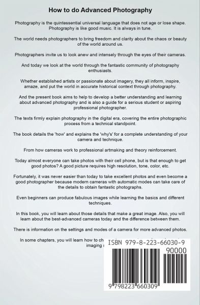 Like painters, photographers continually analyze new concepts and techniques to enhance results. Therefore, get fine photography capturing various moods and creations with proper photography techniques. Analyze elemental topics such as Composition, ISO, Aperture, Sharpness, and other technical aspects like ISO invariance and other photographic elements on a high level. Through this work, you will grasp advanced photography fundamentals and topics. Advanced photography is essential for taking great professional pictures and constantly striving to improve our photographic skills. The hope is that this book serves you well and brings you many joyful photography moments and experiences.