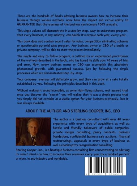 How to Double Your Business Every Year Guaranteed! In one single volume is a step by step by step method to actually double the business of your company. It does not matter if your revenues are $2 million or $2 BILLION....they will be doubled using our simple method that is explained in the book, and can be used by any business. Our firm can provide all the help you may need to achieve this goal, year after year! This is not some scheme, or impossible to understand formula. It is explained in one paragraph! Every business owner will wish he thought about it years ago. So, private companies or public companies can grow their revenues 100% every year, and will increase the value of their business, year after year...and then maybe sell out or take it public via an IPO! The author is a business consultant with 40 years of mergers, acquisitions, friendly and unfriendly acquisitions of public companies,, proxy contests, appraisals, liquidations, and business consulting. You will be working directly with an experienced CEO. Check out: www.sterlingcooper.info Our consulting firm will help you step by step to grow your business quickly.