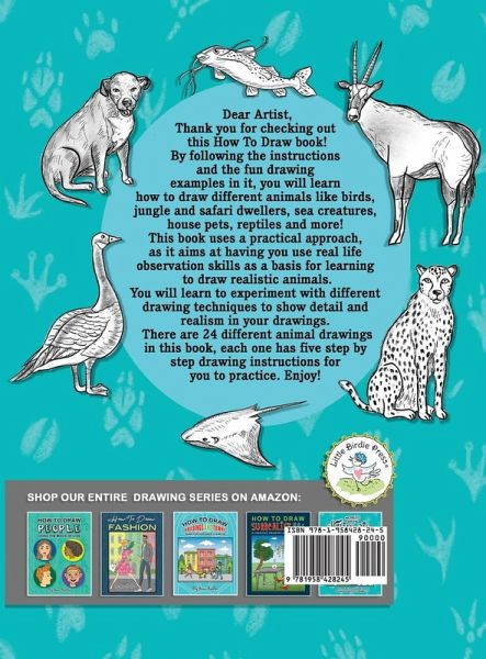 Dear Artist, You will love this How To Draw book because, by following the instructions and the fun drawing examples in it, you will learn how to draw different animals like birds, jungle and safari dwellers, sea creatures, house pets, reptiles, and more! This book uses a practical approach, as it aims at having you use real-life observation skills as a basis for learning to draw realistic animals. You will learn to experiment with different drawing techniques to show detail and realism in your drawings. There are 23 different unique animal drawings in this book, each has five step-by-step drawing instructions for you to practice. Enjoy! Some special features are:23 completely unique animal drawings Five-step drawing breakdown for each of the illustrations Alternative options for different shading techniques Reference photos included for each animal Practice page included for each set of steps Additional practice pages included in the back of the paperback 100% original drawings, not to be found anywhere else Introduction to animal drawing and techniques More How To Draw books available from this publisher Animals you can explore in this book include:Dog Cat Boar Fish Parrot Rabbit Lion Stingray Bear Goose Antelope Elephant Giraffe Goat Zebra Snake Rhino Peacock Ostrich Monkey Llama Leopard Kangaroo Get it today!