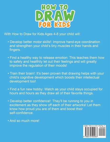 Learning How to Draw Is as Easy as 1, 2, 3, 4! - Encourage Creativity and Imagination With the book How to Draw for Kids Ages 4-8, Packed With 100 Things That Your Children Will Absolutely Love. Maybe you're just looking for a fun new hobby for your kids? Does your child have a wild imagination? Do you want your child to have an effective creative outlet to let their stress out? Well, whatever the reason is, with How to Draw for Kids Ages 4-8 can provide many hours of self directed learning fun and teach any child the amazing craft of drawing! Many kids are over-energetic and just can't seem to sit still. When you're coming home after a long day of work or it's the weekend and you just want to spend a quiet afternoon with your kids, it can be hard to find something to keep them occupied. This drawing book is the solution! Teaching children how to draw from an early age is a great activity that will keep them entertained and occupied for hours on end while having plenty of benefits. After all, drawing enables your children's imagination to be more active which also makes them feel happier and more fulfilled. With How to Draw for Kids Ages 4-8 your child will:Develop better motor skills!: Improve hand-eye coordination and strengthen your child's tiny muscles in their hands and fingers. Find a healthy way to release emotion: This teaches them how to safely and healthily let out their feelings and will greatly improve the regulation of their moods! Train their brain!: It's been proven that drawing helps with your child's cognitive development which boosts their intellectual development too! Find a fun new hobby: Watch as your child stays occupied for hours and hours as they draw all of their favorite things. Develop better confidence!: They'll be running to you in excitement as they show off each of their artworks! Let them know how proud you are of them and boost their self-confidence. And so much more! With over 100 large-print designs to choose from that any child can draw! Plus, they'll also have a chance to bring their own creations to life.