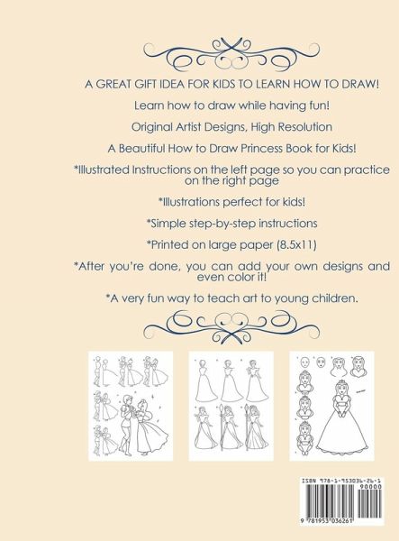 A GREAT GIFT IDEA FOR KIDS TO LEARN HOW TO DRAW! Learn how to draw while having fun! Original Artist Designs, High Resolution A Beautiful How to Draw Princess Book for Kids! *Illustrated Instructions on the left page so you can practice on the right page (paperback only) *Illustrations perfect for kids! *Simple step-by-step instructions *Printed on large paper (8.5x11) *After you're done, you can add your own designs and even color it! *A very fun way to teach art to young children. Scroll Up and Click the "Buy Now" Button!