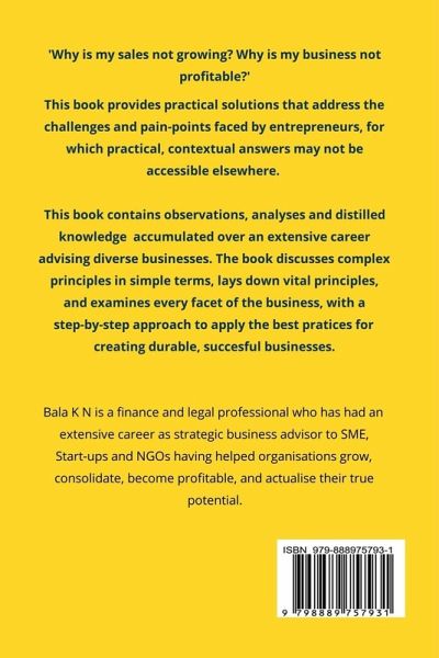 This book strives to provide hard-to-find answers for day-to-day business problems, both mundane and complex. And, to provide practical solutions addressing the challenges and pain-points suffered by businesses, which will enable entrepreneurs to produce the highest success for their businesses by taking advantage of favourable market trends and by preventing failure in the most adverse of business and market circumstances. ¿¿This book relies on the author’s practical knowledge, observations and analyses distilled through an extensive career dealing with diverse businesses as well as research, studies and learnings gained regarding wrong practices that made businesses fail, and the best practices that successful businesses leveraged to produce success. ¿The book aims to express complex principles in simple terms, lay down vital principles, and time-tested practices that can enrich the governance of a business organisation. ¿¿This book collates the information into a well-arranged manual that makes it easy for entrepreneurs to absorb, analyse, engage with, and implement to produce business transformation and the highest success outcome for their Business. This book examines every facet of the business and provides a step-by-step approach to deal with failure producing factors, which entrepreneurs can adopt to avert business failure and lead their businesses to success.