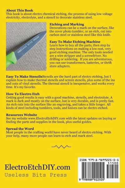 This is an easy to follow guide to making an inexpensive electro etch machine and stencils to decorate stainless steel. The machine is very easy to assemble, and making stencils is easy with the instructions provided.