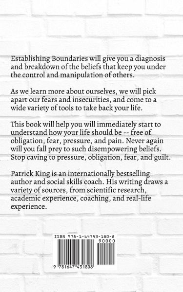 Do you feel like you have to cater to others, and you don't even know why? It's time to stand up for yourself. Who is making the decisions in your life? There is a fine line between being generous and giving, and being too self-sacrificing. It's time to find that line and enforce it. How to manage negativity and say no. Stop being a pushover. Establishing Boundaries will give you a diagnosis and breakdown of the beliefs that keep you under the control and manipulation of others. As we learn more about ourselves, we will pick apart our fears and insecurities, and come to a wide variety of tools to take back your life. This book will help you will immediately start to understand how your life should be -- free of obligation, fear, pressure, and pain. Never again will you fall prey to such disempowering beliefs. Stop caving to pressure, obligation, fear, and guilt. Patrick King is an internationally bestselling author and social skills coach. His writing draws a variety of sources, from scientific research, academic experience, coaching, and real-life experience. Stop lighting yourself on fire to keep others warm. -Porous boundaries, flexible boundaries, and effective boundaries. -The proper language, phrases, and approach to protect yourself. -How to deal with toxic people and vampires. -Extracting yourself from bad situations. -How to make sure that your intentions match your actions. Know your rights, Set your standards. Become your own master. Imagine a life where you set your own rules and only do what you truly want to do. A life where you are immune to outside pressures, and don't feel responsible for people's emotions and feelings. A life where you are free to speak, think, and do what you want.