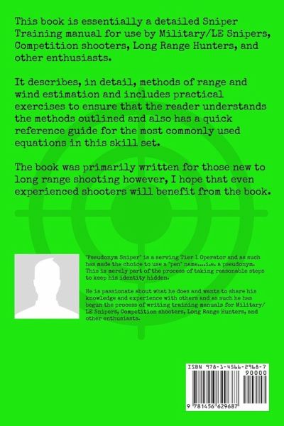 This book is essentially a detailed Sniper Training manual for use by Military/LE Snipers, Competition shooters, Long Range Hunters, and other enthusiasts. It describes, in detail, methods of range and wind estimation and includes practical exercises to ensure that the reader understands the methods outlined and also has a quick reference guide for the most commonly used equations in this skill set. The book was primarily written for those new to long range shooting however, I hope that even experienced shooters will benefit from the book.