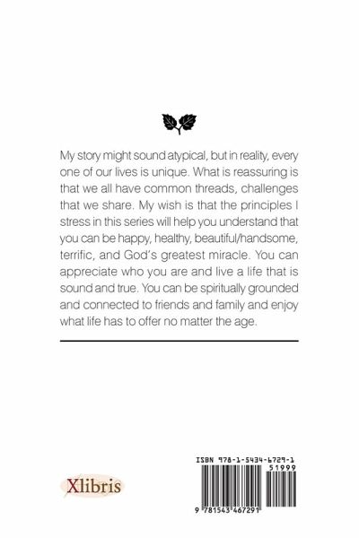 My story might sound atypical, but in reality, every one of our lives is unique. What is reassuring is that we all have common threads, challenges that we share. My wish is that the principles I stress in this series will help you understand that you can be happy, healthy, beautiful/handsome, terrific, and God's greatest miracle. You can appreciate who you are and live a life that is sound and true. You can be spiritually grounded and connected to friends and family and enjoy what life has to offer no matter the age.