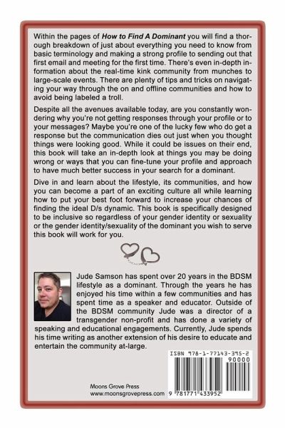 Within the pages of How to Find A Dominant you will find a thorough breakdown of just about everything you need to know from basic terminology and making a strong profile to sending out that first email and meeting for the first time. There's even in-depth information about the real-time kink community from munches to large-scale events. There are plenty of tips and tricks on navigating your way through the on and offline communities and how to avoid being labeled a troll. Despite all the avenues available today, are you constantly wondering why you're not getting responses through your profile or to your messages? Maybe you're one of the lucky few who do get a response but the communication dies out just when you thought things were looking good. While it could be issues on their end, this book will take an in-depth look at things you may be doing wrong or ways that you can fine-tune your profile and approach to have much better success in your search for a dominant. Dive in and learn about the lifestyle, its communities, and how you can become a part of an exciting culture all while learning how to put your best foot forward to increase your chances of finding the ideal D/s dynamic. This book is specifically designed to be inclusive so regardless of your gender identity or sexuality or the gender identity/sexuality of the dominant you wish to serve this book will work for you. About the Author: Jude Samson has spent over 20 years in the BDSM lifestyle as a dominant. Through the years he has enjoyed his time within a few communities and has spent time as a speaker and educator. Outside of the BDSM community Jude was a director of a transgender non-profit and has done a variety of speaking and educational engagements. Currently, Jude spends his time writing as another extension of his desire to educate and entertain the community at-large.