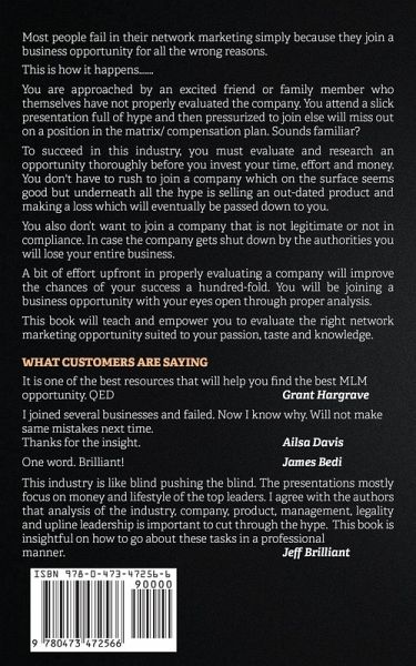 Network marketing is one the most exciting ways to start a new business and create residual income working from home. It costs almost nothing to start, allows for flexible hours, and paves the way for financial independence. Yet so many people fail in this industry simply because they join a business opportunity for all the wrong reasons. This is how it happens……. You are approached by an excited friend or family member who themselves have not properly evaluated the company. You attend a slick presentation full of hype and pressurized into join or will miss out on a position in the matrix/ compensation plan. Sounds familiar? This is the wrong way and you are doomed to fail. To succeed in this industry, you must evaluate and research an opportunity thoroughly before you invest your time, effort and money. You don't have to rush to join a company which on the surface seems good but underneath all the hype is selling an out-dated product and making a loss which will eventually be passed down to you. You also don't want to join a company that is not legitimate or not in compliance. In case the company gets shut down by the authorities you will lose your entire business. A bit of effort upfront in properly evaluating a company will improve the chances of your success a hundred-fold. You will be joining a business opportunity with your eyes open through proper analysis. This book explains all the variables that you need to consider before joining a network marketing business opportunity. It covers the following important aspects: How to researching the network marketing industry to find the most successful industry? How to evaluate companies within an industry to find the market leader? How to evaluating a company's management team? How to Evaluate companies products and services? How to evaluate training provided by a company? How to evaluating marketing material and support provided by a company? How to finding the right team to join? This book will teach and empower you to evaluate the right network marketing opportunity suited to your passion, taste and knowledge. Once you read this book the chances of you succeeding in the network marketing industry will improve dramatically.