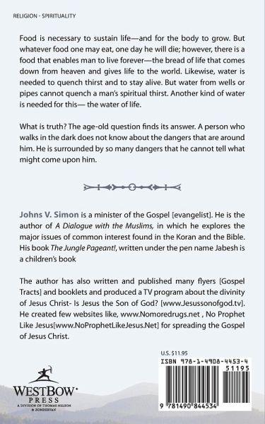 Food is necessary to sustain life--and for the body to grow. But whatever food one may eat, one day he will die; however, there is a food that enables man to live forever--the bread of life that comes down from heaven and gives life to the world. Likewise, water is needed to quench thirst and to stay alive. But water from wells or pipes cannot quench a man?s spiritual thirst. Another kind of water is needed for this--the water of life. What is truth? The age-old question finds its answer. A person who walks in the dark does not know about the dangers that are around him. He is surrounded by so many dangers that he cannot tell what might come upon him.