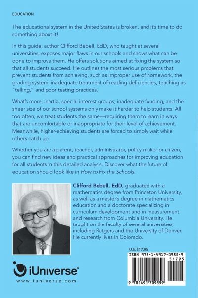 The educational system in the United States is broken, and it's time to do something about it! In this guide, author Clifford Bebell, EdD, who taught at several universities, exposes major flaws in our schools and shows what can be done to improve them. He offers solutions aimed at fixing the system so that all students succeed. He outlines the most serious problems that prevent students from achieving, such as improper use of homework, the grading system, inadequate treatment of reading deficiencies, teaching as "telling," and poor testing practices. What's more, inertia, special interest groups, inadequate funding, and the sheer size of our school systems only make it harder to help students. All too often, we treat students the same-requiring them to learn in ways that are uncomfortable or inappropriate for their level of achievement. Meanwhile, higher-achieving students are forced to simply wait while others catch up. Whether you are a parent, teacher, administrator, policy maker or citizen, you can find new ideas and practical approaches for improving education for all students in this detailed analysis. Discover what the future of education should look like in How to Fix the Schools.