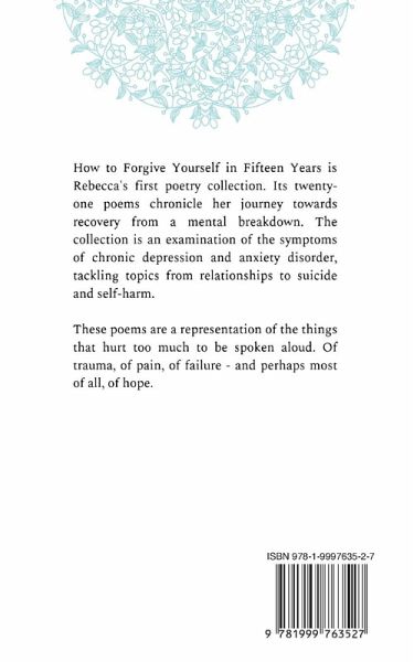How to Forgive Yourself in Fifteen Years is Rebecca's first poetry collection. Its twenty-one poems chronicle her journey towards recovery from a mental breakdown. The collection is an examination of the symptoms of chronic depression and anxiety disorder, tackling topics from relationships to suicide and self-harm. These poems are a representation of the things that hurt too much to be spoken aloud. Of trauma, of pain, of failure - and perhaps most of all, of hope.