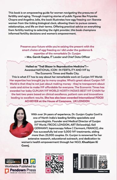 This book is an empowering guide for women navigating the pressures of fertility and aging. Through inspiring stories of public figures like Priyanka Chopra and Angelina Jolie, the book illustrates how egg freezing can liberate women from the ticking biological clock, allowing them to pursue careers, relationships, and life on their terms. Offering practical advice on everything from fertility testing to selecting the right provider, this book champions informed fertility decisions and women's empowerment.With over 24 years of experience, Dr. Gunjan Gupta Govil is one of North India's leading fertility specialists and gynecologists. Founder and Medical Director of Gunjan IVF World, FRCOG LONDON, ART (fellowship), Keil GERMANY, laparoscopy fellow (Clermont, FRANCE), she has successfully led over 5,000 IVF treatments, aiding more than 25,000 couples. Dr. Gunjan is renowned for her extensive research, educational outreach, and dedication to women's health empowerment through her NGO, Khushiyon Ki Goonj.
