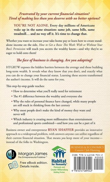 What Employers Won't Tell You About Today's Economy The face of business is changing. Are you adapting along with it? Do you find yourself frustrated by your current financial situation? Are you tired of not making what you deserve and annoyed with not having better options? You're not alone. Every day millions of Americans wake up in the same situation: same job, same bills, same treadmill. . .and no way off it. It's time to change that. Whether you want to increase your take-home pay or learn how to create standalone income on the side, "How to Get a Raise This Week: With or Without Your Boss's Permission "will teach you secrets the wealthy know---and why they're so eager to hold onto them! "How to Get a Raise This Week: With or Without Your Boss's Permission "exposes the hidden barriers between the average and those who build long-term wealth. It will highlight what they know that you don't, and exactly what you can do to change your financial status. Learning these secrets transformed the author's income. It will do the same for you. This step-by-step guide teaches: * How to determine exactly what you'll need for retirement * The #1 difference between the wealthy and everyone else * Why the rules of personal finance have changed, while many people are still stuck in outdated thinking * Why most people don't make the kind of money they want and never will * One thing virtually every employee overlooks--and what it says to your employer * An easy method for cutting everyday expenses by up to 33 percent * Why you're investing in all the wrong things * Which industry is creating more millionaires than entertainment and professional sports combined--and how you can be a part of it In "How to Get a Raise This Week," business owner and entrepreneur Ryan Shaffer provides an innovative approach to a widespread problem with answers anyone can utilize regardless of their current monetary or labor situation. That means you keep more of your income---instead of the folks in Washington.