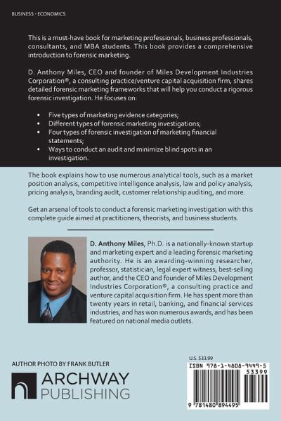 This is a must-have book for marketing professionals, business professionals, consultants, and MBA students. This book provides a comprehensive introduction to forensic marketing. D. Anthony Miles, CEO and founder of Miles Development Industries Corporation(R), a consulting practice/venture capital acquisition firm, shares detailed forensic marketing frameworks that will help you conduct a rigorous forensic investigation. He focuses on: ¿ Five types of marketing evidence categories; ¿ Different types of forensic marketing investigations; ¿ Four types of forensic investigation of marketing financial statements; ¿ Ways to conduct an audit and minimize blind spots in an investigation. The book explains how to use numerous analytical tools, such as a market position analysis, competitive intelligence analysis, law and policy analysis, pricing analysis, branding audit, customer relationship auditing, and more. Get an arsenal of tools to conduct a forensic marketing investigation with this complete guide aimed at practitioners, theorists, and business students. Miles has made forensic marketing investigation methods accessible to business professionals and students. "How To Get Away With Murder in Marketing" contains numerous useful investigative frameworks and images to help conduct a forensic marketing investigation. "How To Get Away With Murder in Marketing" gives readers the confidence to do a forensic marketing investigation. Forensic marketing investigation requires specific tools and skills. "How To Get Away With Murder in Marketing" provides the tools to help the business profession build those skills. This book will teach you how to be a forensic marketing expert. The book provides readers with access to forensic marketing investigative frameworks and analytical models to help you solve marketing problems. For readers this book is filled with forensic marketing tools and analytical techniques to help the marketing expert solve marketing problems. The practice of an effective forensic marketing investigation is provided and shows how to implement an effective investigation into marketing problems. Throughout the following chapters, readers will learn about five categories of evidence that include information such as data, sales, marketing financials, market reports, law and policy, market size, market share, financial resources, historical performance, current market position, product and firm, customer market segments, pricing models, fixed costs, variable costs, revenue, unit contribution, breakeven, product lines, brand awareness, brand strength, brand differentiation, brand presence, brand relevance, and brand performance. In this book, readers are provided with five categories of forensic marketing tools are illustrated, complete with examples of demonstrating applications in the real-world marketing problems. This area of specialty will be considered the top niche market in the marketing profession. "How To Get Away With Murder in Marketing" should be required reading for practitioners, theorists and business students.