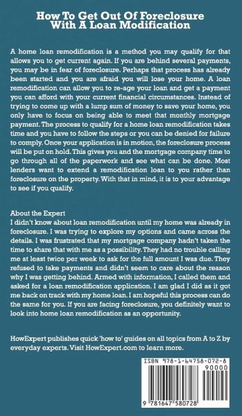 If You Want To Learn How to Get Out of Foreclosure with a Loan Modification, Then Get This Potentially Life Saving Book! A home loan remodification is a method you may qualify for that allows you to get current again. If you are behind several payments, you may be in fear of foreclosure. Perhaps that process has already been started and you are afraid you will lose your home. A loan remodification can allow you to re-age your loan and get a payment you can afford with your current financial circumstances. Instead of trying to come up with a lump sum of money to save your home, you only have to focus on being able to meet that monthly mortgage payment. The process to qualify for a home loan remodification takes time and you have to follow the steps or you can be denied for failure to comply. Once your application is in motion, the foreclosure process will be put on hold. This gives you and the mortgage company time to go through all of the paperwork and see what can be done. Most lenders want to extend a remodification loan to you rather than foreclosure on the property. With that in mind, it is to your advantage to see if you qualify. About the Expert I didn’t know about loan remodification until my home was already in foreclosure. I was trying to explore my options and came across the details. I was frustrated that my mortgage company hadn’t taken the time to share that with me as a possibility. They had no trouble calling me at least twice per week to ask for the full amount I was due. They refused to take payments and didn’t seem to care about the reason why I was getting behind. Armed with information, I called them and asked for a loan remodification application. I am glad I did as it got me back on track with my home loan. I am hopeful this process can do the same for you. If you are facing foreclosure, you definitely want to look into home loan remodification as an opportunity. HowExpert publishes quick 'how to' guides on all topics from A to Z by everyday experts.