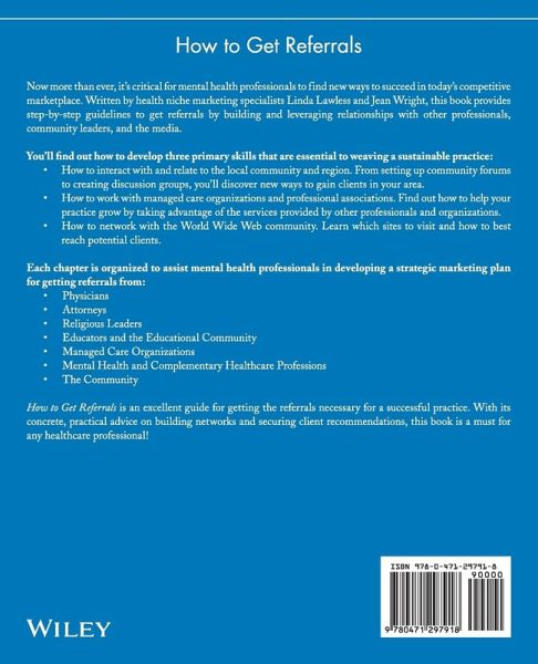 Now more than ever, it's critical for mental health professionals to find new ways to succeed in today's competitive marketplace. Written by health niche marketing specialists Linda Lawless and Jean Wright, this book provides step-by-step guidelines to get referrals by building and leveraging relationships with other professionals, community leaders, and the media. You'll find out how to develop three primary skills that are essential to weaving a sustainable practice: * How to interact with and relate to the local community and region. From setting up community forums to creating discussion groups, you'll discover new ways to gain clients in your area. * How to work with managed care organizations and professional associations. Find out how to help your practice grow by taking advantage of the services provided by other professionals and organizations. * How to network with the World Wide Web community. Learn which sites to visit and how to best reach potential clients. Each chapter is organized to assist mental health professionals in developing a strategic marketing plan for getting referrals from: * Physicians * Attorneys * Religious Leaders * Educators and the Educational Community * Managed Care Organizations * Mental Health and Complementary Healthcare Professions * The Community How to Get Referrals is an excellent guide for getting the referrals necessary for a successful practice. With its concrete, practical advice on building networks and securing client recommendations, this book is a must for any healthcare professional!