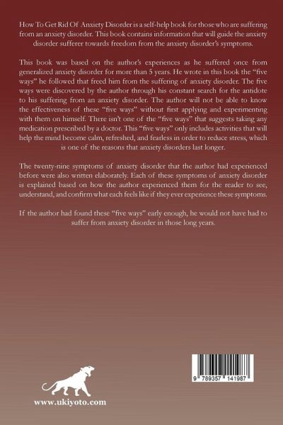 How To Get Rid Of Anxiety Disorder is a self-help book for those who are suffering from an anxiety disorder. This book contains information that will guide the anxiety disorder sufferer towards freedom from the anxiety disorder's symptoms. This book was based on the author's experiences as he suffered once from generalized anxiety disorder for more than 5 years. He wrote in this book the ""five ways"" he followed that freed him from the suffering of anxiety disorder. The five ways were discovered by the author through his constant search for the antidote to his suffering from an anxiety disorder. The author will not be able to know the effectiveness of these ""five ways"" without first applying and experimenting with them on himself. There isn't one of the ""five ways"" that suggests taking any medication prescribed by a doctor. This ""five ways"" only includes activities that will help the mind become calm, refreshed, and fearless in order to reduce stress, which is one of the reasons that anxiety disorders last longer. The twenty-nine symptoms of anxiety disorder that the author had experienced before were also written elaborately. Each of these symptoms of anxiety disorder is explained based on how the author experienced them for the reader to see, understand, and confirm what each feels like if they ever experience these symptoms. If the author had found these ""five ways"" early enough, he would not have had to suffer from anxiety disorder in those long years.