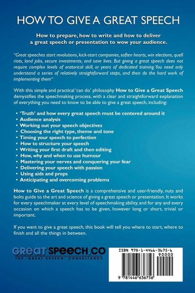 How to prepare, how to write and how to deliver a great speech or presentation to wow your audience. "How to Give a Great Speech" is a comprehensive and user-friendly, nuts and bolts guide to the art and science of giving a great speech or presentation. It works for every speechmaker at every level of speechmaking ability, and for any and every occasion on which a speech or presentation has to be given, however long or short, trivial or important. If you want to give a great speech or presentation, this book will tell you where to start, where to finish and all the things in between.