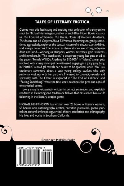 TALES OF LITERARY EROTICA Comes now this fascinating and enticing new collection of transgressive smut by Michael Hemmingson, author of such Blue Moon Books classics as The Comfort of Women, The Dress, House of Dreams, Amateurs, The Rooms, and 66 Chapters About 33 Women. Hemmingson gently, sometimes aggressively, explores the sensual nature of trains, cars, art exhibits, and foreign countries. The women in these stories are strong, independent, and lurid -- working as strippers, writers, actresses, grad students, and filmmakers. In "The Installation," a desperate young lass puts an ad in the paper: "Female Will Do Anything for $10.000." In "Jolene," a man gets involved with a sassy strumpet he witnessed engaging in a juicy gang bang. In "Natalie," a bold gal reveals her desire to be spanked, while "Mo" is a cautionary adventure about a sexy young college student who only performs oral sex with her partners. The need to connect, sexually and spiritually, with The Other is explored in "The End of Celibacy" and "Feeling Something," while the title story examines the pros and cons of extramarital coitus. Every story is eloquently written in perfect sentences, and explicitly rendered in Hemmingson's trademark fashion that has earned him a cult following in the literary erotica genre.