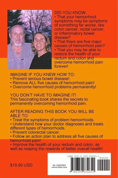 DID YOU KNOW: ¿ That your hemorrhoid symptoms may be symptoms of something far worse, like colon cancer, rectal cancer, or inflammatory bowel disease? ¿ That there are five major causes of hemorrhoid pain? ¿ That you may be able to restore the health of your rectum and colon and overcome hemorrhoid pain forever! IMAGINE IF YOU KNEW HOW TO: ¿ Prevent serious bowel disease! ¿ Remove ALL five causes of hemorrhoid pain! ¿ Overcome hemorrhoid problems permanently! YOU DON'T HAVE TO IMAGINE IT! This fascinating book shares the secrets to permanently overcoming hemorrhoid pain. AFTER READING THIS BOOK YOU WILL BE ABLE TO: ¿ Treat the symptoms of problem hemorrhoids. ¿ Understand how your doctor diagnoses and treats different types of hemorrhoids. ¿ Prevent colorectal cancer. ¿ Follow an action plan to address all five causes of hemorrhoid pain! ¿ Improve the health of your rectum and colon, as well as reaping the rewards of better overall health!