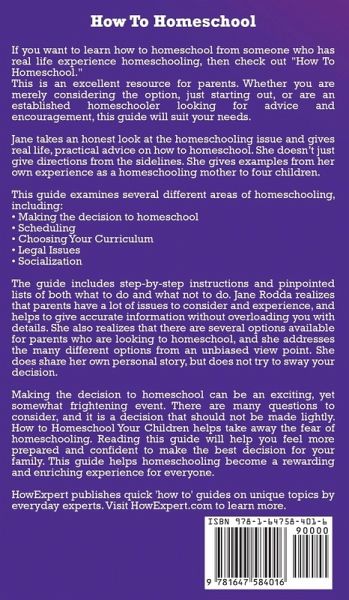 If you want to learn how to homeschool from someone who has real life experience homeschooling, then check out "How To Homeschool" by Jane Rodda. This is an excellent resource for parents. Whether you are merely considering the option, just starting out, or are an established homeschooler looking for advice and encouragement, this guide will suit your needs. Jane takes an honest look at the homeschooling issue and gives real life, practical advice on how to homeschool. She doesn't just give directions from the sidelines. She gives examples from her own experience as a homeschooling mother to four children. This guide examines several different areas of homeschooling, including: - Making the decision to homeschool - Scheduling - Choosing Your Curriculum - Legal Issues - Socialization The guide includes step-by-step instructions and pinpointed lists of both what to do and what not to do. Jane Rodda realizes that parents have a lot of issues to consider and experience, and helps to give accurate information without overloading you with details. She also realizes that there are several options available for parents who are looking to homeschool, and she addresses the many different options from an unbiased view point. She does share her own personal story, but does not try to sway your decision. Making the decision to homeschool can be an exciting, yet somewhat frightening event. There are many questions to consider, and it is a decision that should not be made lightly. How to Homeschool Your Children helps take away the fear of homeschooling. Reading this guide will help you feel more prepared and confident to make the best decision for your family. This guide helps homeschooling become a rewarding and enriching experience for everyone. About the Expert Jane Rodda holds a Bachelor's Degree in Liberal Studies with a concentration in Psychology from Point Loma Nazarene University in San Diego, California. She currently lives in Nashville, Tennessee, but has previously lived and worked in several places in the United States. Jane has over twenty years experience working in Christian Day Camps. Her first job was as an assistant craft counselor, and through the years she worked her way up to eventually directing the camps, and then eventually pioneering a brand new day camp program which served a community desperately in need of programs for children. She wrote How To Start a Christian Day Camp because she passionately believes that Day Camps provide an excellent opportunity for churches to be able to reach several members of the community. Jane has seen camps meet the needs of parents, by providing something for their children; kids, by providing fun and exciting programs, and youth, by providing an opportunity to serve. Jane has learned a lot through all of her experiences, and she seeks to help others learn as well. Her hope is that churches or individuals will be encouraged and inspired to start Christian Day Camps and see the fun and exciting changes they can bring to a community. HowExpert publishes quick 'how to' guides on all topics from A to Z by everyday experts.