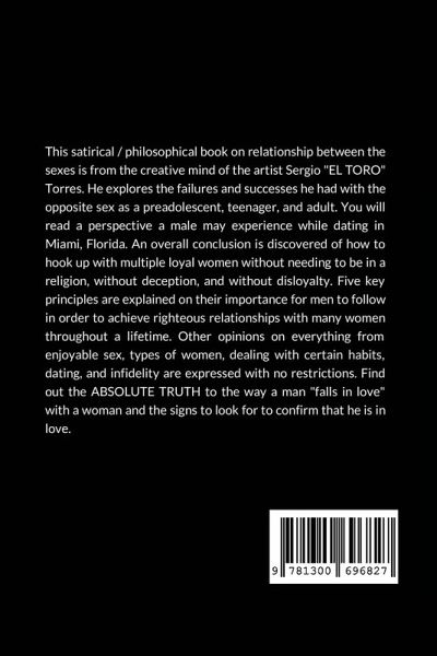 This satirical/philosophical book on relationship between the sexes is the workings of artist Sergio "EL TORO" Torres. He explores the failures and successes he had with the opposite sex as a preadolescent, teenager, and adult. You will read a perspective to the experiences many males go through in Miami, Florida. An overall conclusion is discovered of how to hook up with multiple loyal women without needing to be in a religion, without deception, and without disloyalty. Five key principles are explained on how important they are for men to follow in order to achieve righteous relationships with many women throughout a lifetime. Other opinions on everything from enjoyable sex, types of women, dealing with certain habits, dating, and infidelity are expressed with no restrictions. Find out the ABSOLUTE TRUTH to the way a man falls "in love" with a woman and the signs to look for confirming that he is in love.
