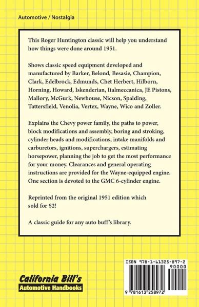 This Roger Huntington classic will help you understand how things were done in 1951! This book is a reprint of the original edition first published in 1951. Some of the items covered are speed tuning theory and practice, building costs, as well as horsepower and torque specifications for 1937-54 Chevrolet 6 cylinder engines, including the 228, 248, and 270 GMC engines. Procedures and components detailed include fitting the block, stock and special Wayne and Horning cylinder heads, rocker arms, pushrods, cams, boring for larger pistons, rings, drilled crank-shafts, intake manifolds, exhaust headers, ignitions and superchargers. Also highlighted are classic speed equipment components developed and manufactured by Barker, Belond, Besasie, Champion, Clark, Edelbrock, Edmunds, Chet Herbert, Hilborn, Horning, Howard, Iskenderian, Italmeccanica, JE Pistons, Mallory, McGurk, Newhouse, Nicson, Spalding, Tattersfield, Venolia, Vertex, Wayne, Wico and Zoller. Explanation of the Chevy power family is included, as well as the path to power, block modification and assembly, estimating horsepower, and planning the job to get the most performance for your money. Clearances and general operating instructions are provided for the Wayne-equipped engine. Whether you want to hop up your Chevrolet 6 for a period correct build, or are just curious about how things were done in 1951, this little guide will be a fun addition to your library.