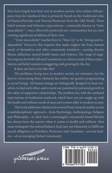 Men have largely lost their way in modern society. Our culture still prepares boys for manhood that is primarily based on the traditional roles of Hunter/Provider and Warrior/Protector from the Old World. These belief systems and behavior expectations-commonly known as "toxic masculinity"-once effectively protected our communities but are now creating significant problems of their own. "Toxic masculinity" teaches boys to "Man Up" to be "strong and independent." However, this requires that males neglect the basic human needs of themselves and other community members-causing chronic illness, addiction, mental health issues, and violence. The range of negative impacts for both Self and Community as a direct result of these expectations and belief systems is staggering and growing by the day. It does not have to be like this! The problems facing men in modern society are extensive, but the keys to overcoming these obstacles lies within our genetic programming as social beings. All human beings are biologically designed to heal ourselves, to heal each other, and to meet our potential for personal growth in the safety of supportive relationships. The problem lies with the outdated expectations of traditional manhood, which have not yet caught up with the health and wellness needs of men and women alike in modern society. This book addresses solutions borrowed from research studies across a multidisciplinary approach-from Psychology, Anthropology, Religion and Philosophy-to show how a meaningful community-based lifestyle has always been the answer when it comes to health and wellness. Men must reintegrate this natural balance back into our Humanity to fulfill our sacred obligation as Providers, Protectors and Guardians-servant leaders-of an emerging Global Community.