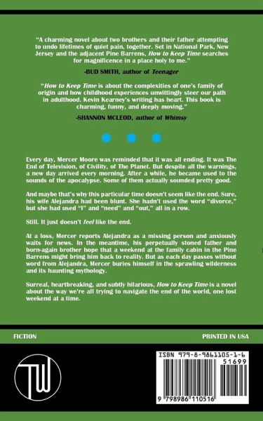 Every day, Mercer Moore was reminded that it was all ending. It was The End of Television, of Civility, of The Planet. Maybe that's why it doesn't seem like the end for Mercer. Sure, his wife Alejandra had been blunt. She hadn't used the word "divorce," but she had used "I" and "need" and "out," all in a row. Still. It just doesn't feel like the end. Rather than deal with the reality of her absence, Mercer reports Alejandra as missing to a skeptical detective and prays he's not subsequently considered a suspect. Fearing he's losing his grip, his brother Evan and father Lake suggest a weekend trip in the hopes that time away will lead to some clarity. But the retreat to the family cabin in the New Jersey Pine Barrens only leads to more problems. Evan, recently sober and born-again, offers condescending platitudes while Lake, a widowed former hippie, is too stoned to present any real solutions. As each day passes without word from Alejandra, Mercer becomes more immersed in the sprawling, haunted wilderness of the Pine Barrens and its unsettling mythology. When he stumbles upon an unexpected discovery hiding there, he's forced to reckon with the reality of his marriage or continue crawling further into his comforting delusion. HOW TO KEEP TIME is a millennial novel reminiscent of Andrew Martin's EARLY WORK and Miranda Popkey's TOPICS OF CONVERSATION. It's THIS IS WHERE I LEAVE YOU narrated with the formal experimentation of Jenny Offill and Scott McClanahan.