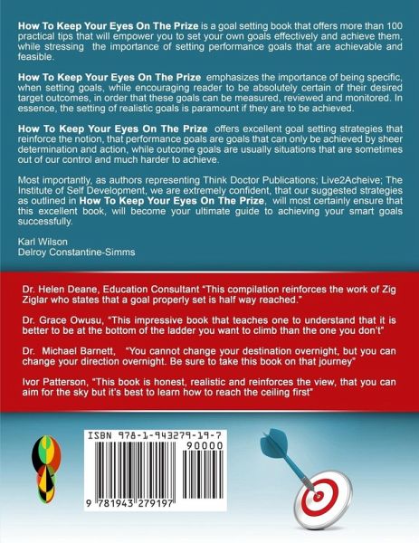 How To Keep Your Eyes on the Prize, offers more than 100 practical tips that will empower you to set your own goals effectively and achieve them and stresses the importance of setting performance goals that are achievable and feasible. This guide book also reminds users that performance goals are goals that can only be achieved by sheer determination and action, while outcome goals are usually situations that are sometimes out of our control. Furthermore, this guide book emphasizes the importance of being specific when setting goals, while encouraging users to be absolutely certain of their desired target outcomes so these goals can be measured, reviewed and monitored. In essence, the setting of realistic goals is paramount if they are to be achieved. The excellent tips on goal setting and goal achievement is not about encouraging readers to aim for the sky, but instead aim for the ceiling instead, quite simply, because the ceiling is realistically more attainable than the sky. Most importantly, How to Keep Your Eyes on the Prize encourages the application of reality check strategies relating to your resources, your skills. In fact, we are extremely confident that this excellent book goal setting will do more than assist you in achieving those goals. In fact, the authors are extremely confident that the suggested strategies outlined in this excellent compilation, by way of simplicity and practicality will certainly become your ultimate guide to achieving smart goals successfully.