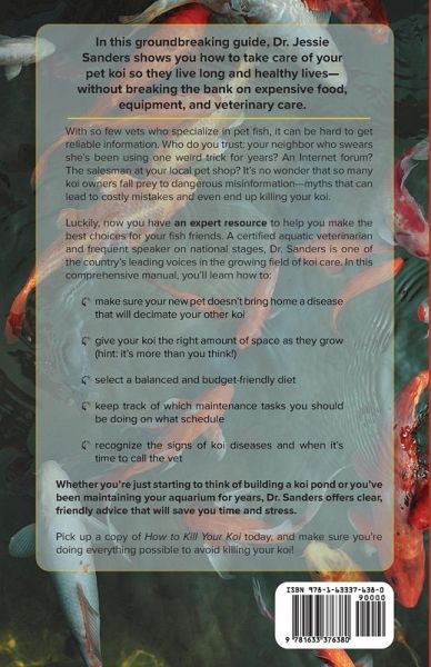 In this groundbreaking guide, Dr. Jessie Sanders shows you how to take care of your pet koi so they live long and healthy lives-without breaking the bank on expensive food, equipment, and veterinary care. With so few vets who specialize in pet ¿sh, it can be hard to get reliable information. Who do you trust: your neighbor who swears she's been using one weird trick for years? An Internet forum? The salesman at your local pet shop? It's no wonder that so many koi owners fall prey to dangerous misinformation-myths that can lead to costly mistakes and even end up killing your koi. Luckily, now you have an expert resource to help you make the best choices for your ¿sh friends. A certi¿ed aquatic veterinarian and frequent speaker on national stages, Dr. Sanders is one of the country's leading voices in the growing ¿eld of koi care. In this comprehensive manual, you'll learn how to:make sure your new pet doesn't bring home a disease that will decimate your other koi give your koi the right amount of space as they grow (hint: it's more than you think!) select a balanced and budget-friendly diet keep track of which maintenance tasks you should be doing on what schedule recognize the signs of koi diseases and when it's time to call the vet Whether you're just starting to think of building a koi pond or you've been maintaining your aquarium for years, Dr. Sanders offers clear, friendly advice that will save you time and stress. Pick up a copy of How to Kill Your Koi today, and make sure you're doing everything possible to avoid killing your koi!