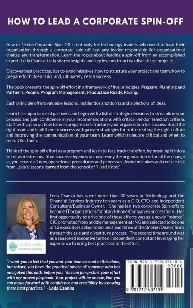 This book is for Technology Leaders who need to lead their organization through a corporate spin-off. The breadth and scope ofthis effort is vast, and the process is both exciting and overwhelming at the same time. It can be unclear how to begin and whereto turn to for support and help.