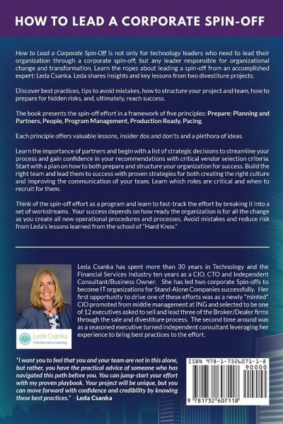 This book is for Technology Leaders who need to lead their organization through a corporate spin-off. The breadth and scope ofthis effort is vast, and the process is both exciting and overwhelming at the same time. It can be unclear how to begin and whereto turn to for support and help.