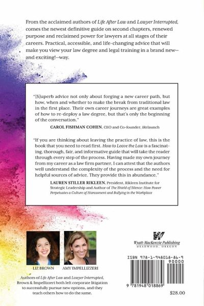 As featured in Bloomberg Law, Boston Business Journal, Medium, and more! From the acclaimed authors of LIFE AFTER LAW (Liz Brown, Harvard-trained lawyer turned business professor) and LAWYER INTERRUPTED (Amy Impellizzeri, former Skadden Arps litigator turned novelist) comes a new guidebook for lawyers who find themselves asking "How do I leave the law?" or "How can I find a more fulfilling career?" With case studies and practical steps on how to assess your current situation, leverage the versatility of your JD and write your own compelling next chapter, HOW TO LEAVE THE LAW is the perfect roadmap for lawyers in any stage of their career as they wonder: what if?
