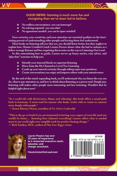 Good news: listening is much more fun and energizing than we've been led to believe. No endless conversations- you can interrupt! No solving required-you can relax! No agreement needed-you can be open-minded! Your curiosity, your creativity, and your attention are essential qualities in the fascinating pursuit of understanding other people and having them feel understood. Most books on listening tell you that yes, you should listen better, but they neglect to explain how. Master Certified Coach Lauren Powers shares what she had to unlearn as a below-average listener and her surprising discoveries on the way to Listening Out Loud. In this entertaining how-to guide, Lauren serves up funny stories, wise advice, and "play date" exercises to help you:Identify your internal blocks to superstar listening Move from the Me Channel to Level Two Listening Crank up your natural curiosity through asking super easy questions Create conversations you enjoy and impress others with your attentiveness By the end of this mind-expanding book, you'll understand why you listen the way you do, what to pay attention to, and how to think about listening as a power tool. Simply put, listening well makes other people more interesting and less irritating. Wouldn't that be helpful right about now?